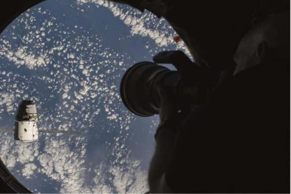 SpaceX的龙号货运飞船接近国际空间站时,飞行工程师亚历山大·格斯特在穹顶舱的一个窗口旁拍照。