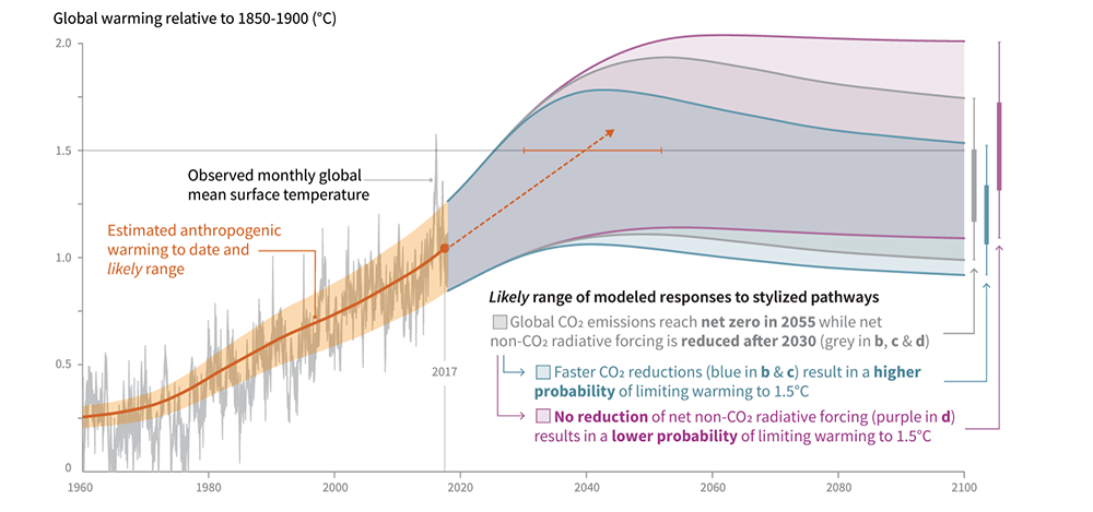 工业化进程以来全球气温变化以及1.5℃温升控制目标下排放路径(来源:《IPCC全球升温1.5℃特别报告》)