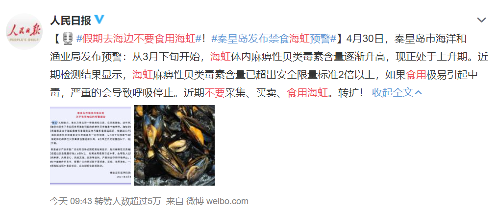 在我国,5月份是去海边游玩的最佳时节,不冷不热。去海边必吃海鲜,然而最近秦皇岛海洋和渔业局发布最新预警,警告:假期去海边不要食用海虹,严重会导致呼吸停止!