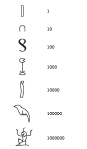比100 还要大的数字,古埃及人也能写出来,例如1000 像一支火炬(也有人说这是一朵莲花),1 万像一根手指,10 万是一只神鸟,100 万是一个单膝跪地、双手投降、仿佛被这个巨大数字吓怕了的人。