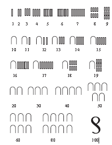 以上图古埃及数字为例:1 的符号是一竖,像一根棍子;2 的符号是两竖, 像两根棍子;以此类推,3 是三根棍子,4 是四根棍子,5 是五根棍子……到了10,符号变成一道拱形(据说这个符号是一只踝骨),好像字母n,又像集合运算符号里计算交集的∩。然后呢?11 是一道拱加一竖,12 是一道拱加两竖,13 是一道拱加三竖……到了20,用两道拱来表示;30 是三道拱,40 是四道拱,50是五道拱……100 呢?被写成一个曲里拐弯的符号,仿佛缺了左下角的8,又仿佛是头朝上的小蝌蚪。