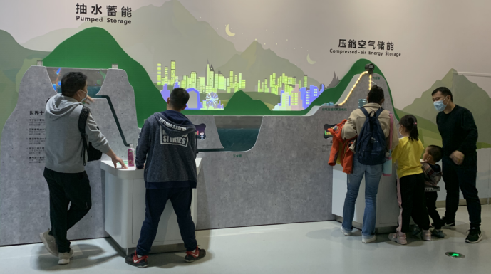 还有一件展品“抽水蓄能”也引得很多观众驻足,真实的水流、转动的水轮,配合多媒体动画和山水造景,生动有趣,直观展示了储能电站的作用:发电量大于用电量时抽水储能,小于时放水发电。用把水抽到高处的方式就可以把电储存起来,节能高效,真是降低碳排放的好办法。
