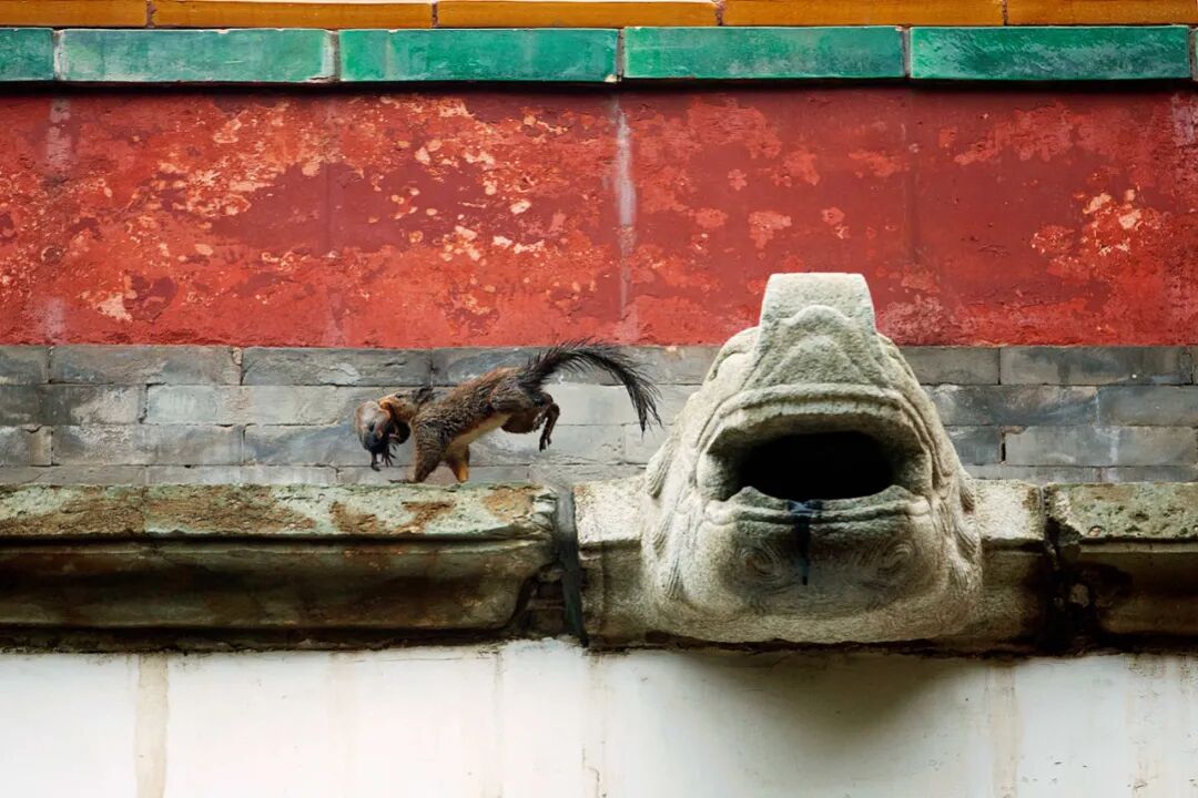 一只欧亚红松鼠母亲带着幼崽搬家。除公园绿地,一些遍植松柏的寺庙古建筑群也为野生动物提供了生活空间。生活在人类主导的环境中,许多野生动物已经学会充分利用资源,规避不必要的风险。张瑜 / 摄