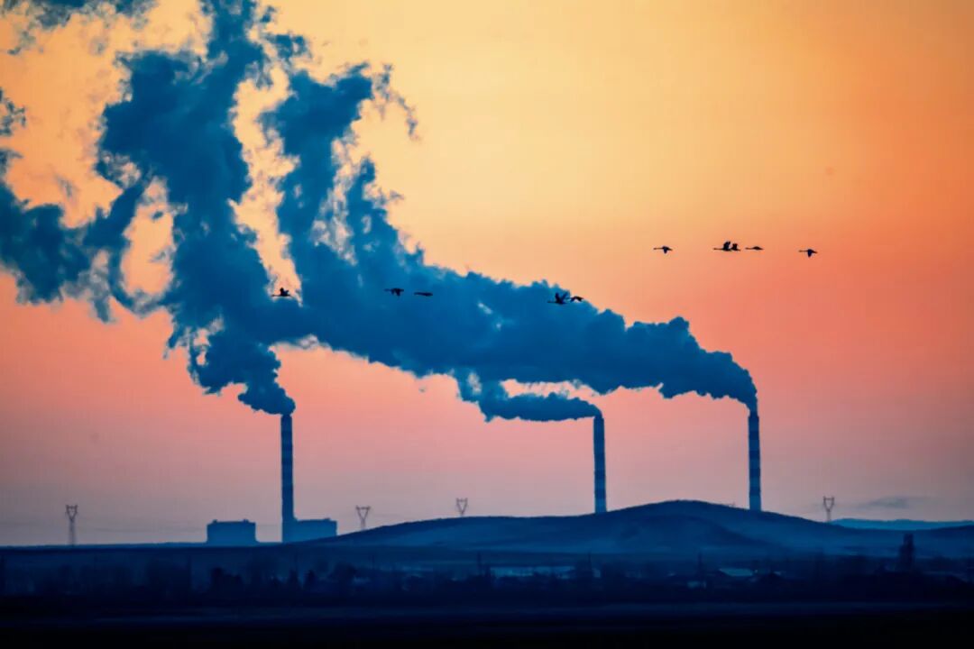 迁徙的雁群飞过夕阳下的天空,巨大的烟囱喷出滚滚烟尘。徐永春 / 摄