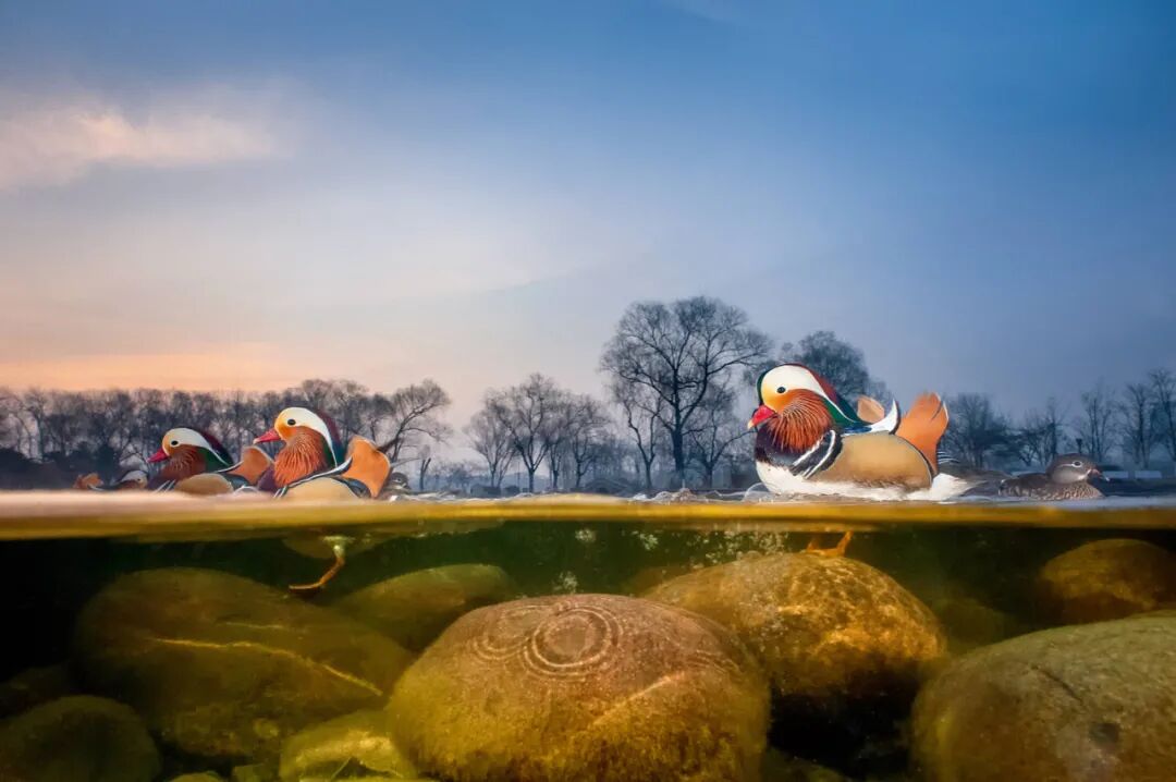 鸳鸯是东亚特有的水禽,因为艳丽的羽毛和对爱情的寓意受到人们青睐。它们也是许多城市中最常见的水鸟。图为摄影师利用伪装好的遥控相机拍摄北京玉渊潭公园中的鸳鸯。关鹏 自然影像中国 / 摄