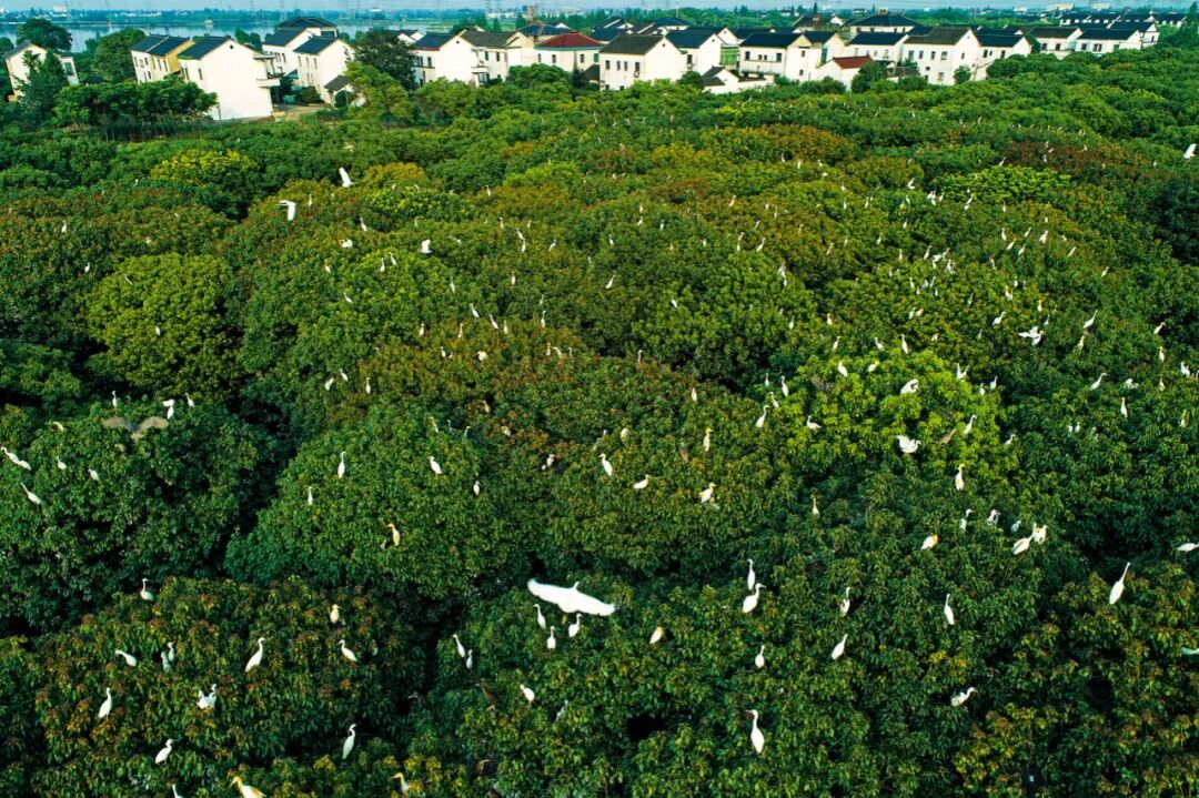苏州吴江,震泽省级湿地公园,繁殖季大群的鹭鸟栖息在江南村舍旁成片的香樟林树冠层上。孙晓东 / 摄