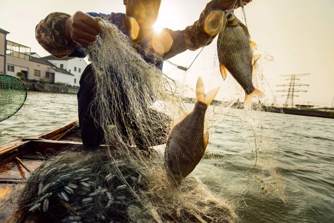 苏州吴江,震泽省级湿地公园,月半湾。当地渔民在6月收获鳊鱼。孙晓东 / 摄