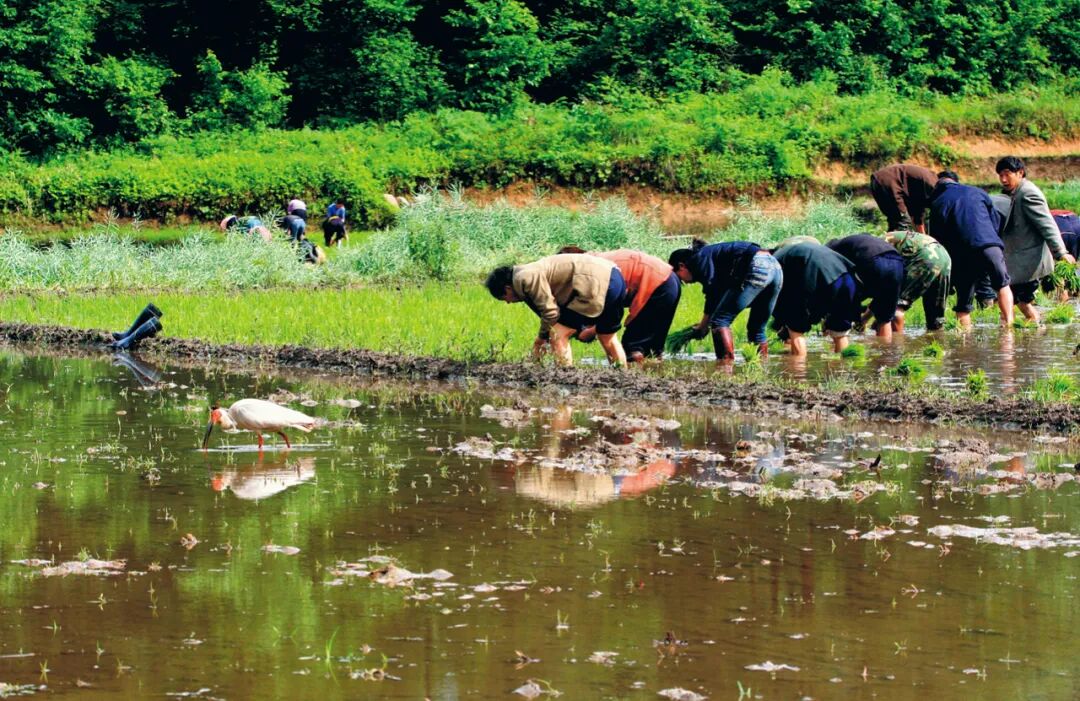 有“东方红宝石”之称的朱鹮就习惯在稻田中觅食泥鳅、蛙、田螺和贝类等水生动物,并在附近的大树上筑巢繁殖。
