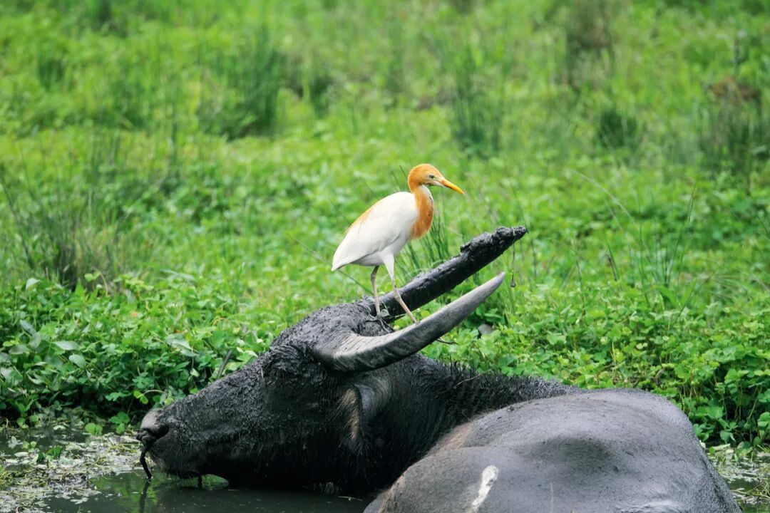 从水牛与牛背鹭的关系中,我们能看到中国传统农业与自然的相契。牛背鹭是在长江以南的水田中常见的鸟类,它们常停歇在耕牛背上,取食被这些大动物惊起的昆虫,也会啄食牛身上的寄生虫。 吴秀山 / 摄