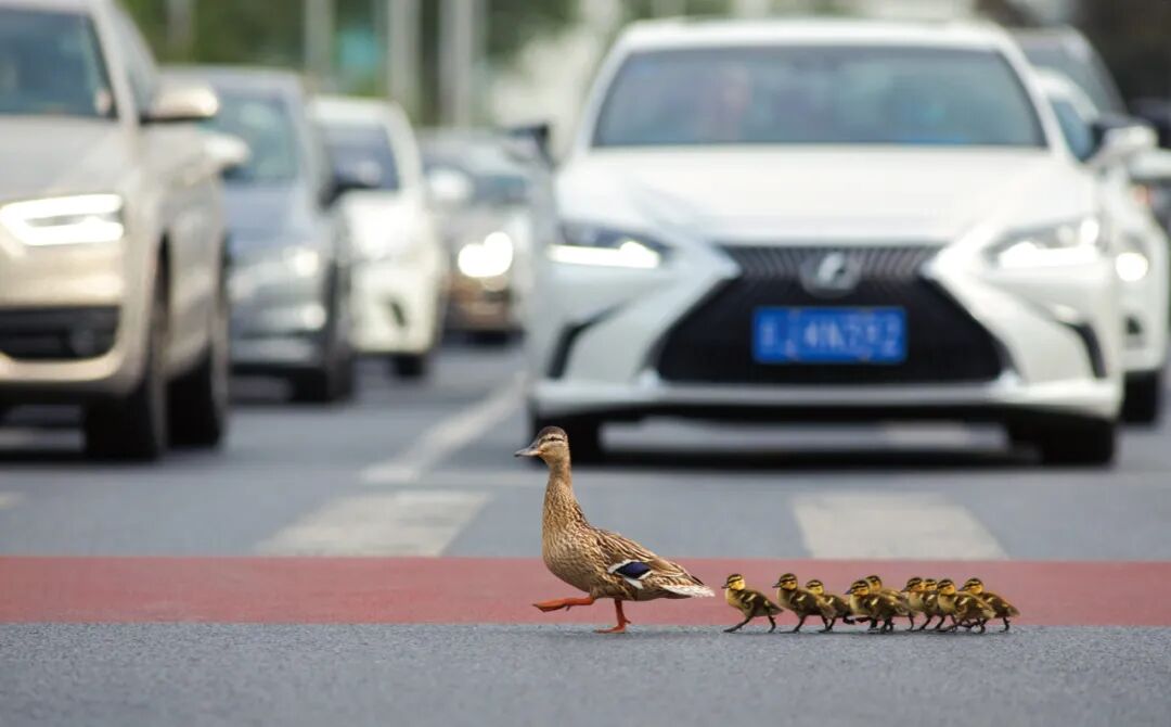 北京,绿头鸭妈妈带孩子过马路,马路上上演了温馨的一幕。张瑜 / 摄