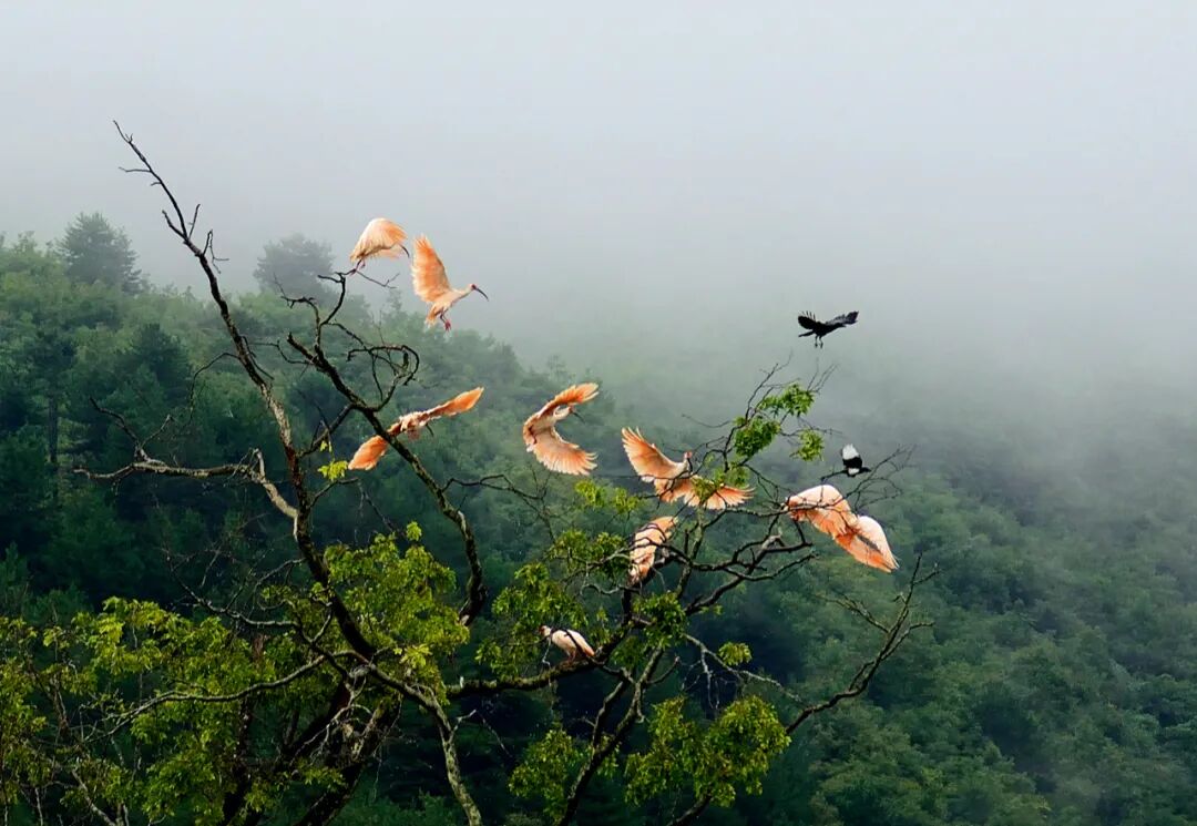 在树上的朱鹮,与喜鹊共舞。赵纳勋/ 摄