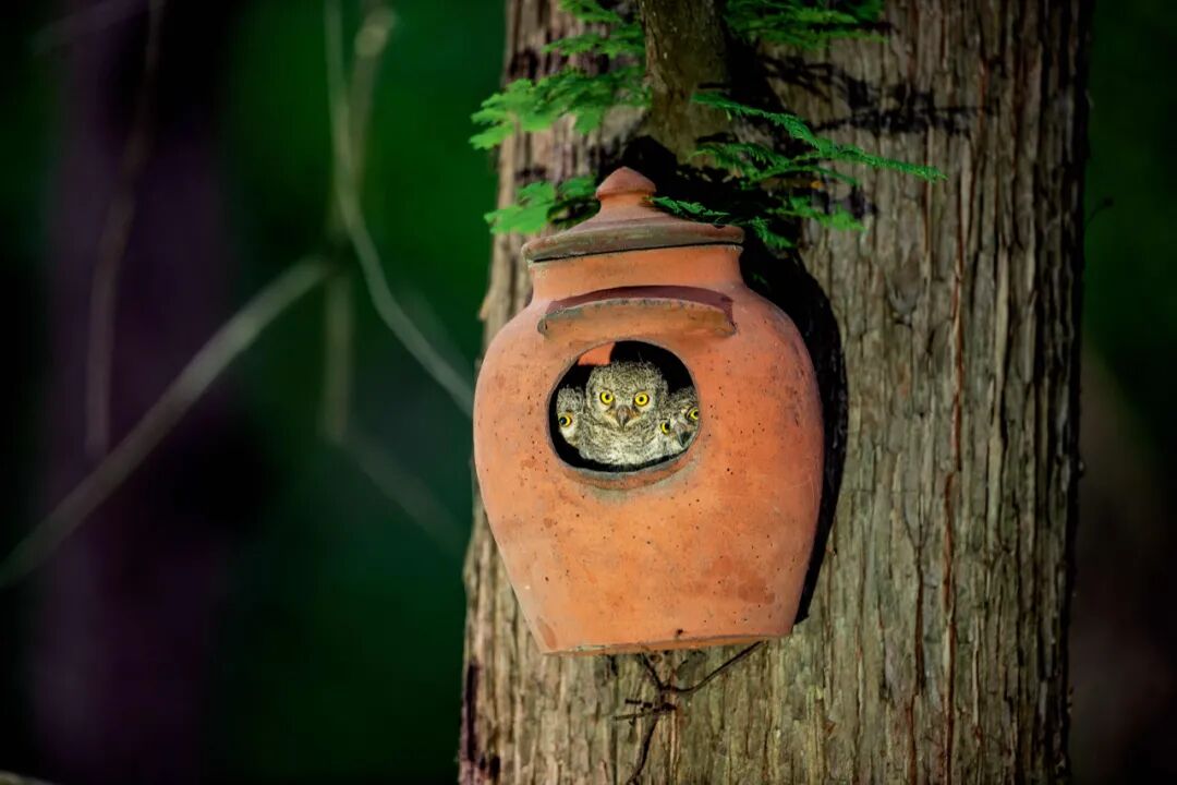 人工巢可以为那些偏爱树洞的鸟类解决“住房难题”。这个瓦罐成为红角鸮一家的住处。赵建英 / 摄