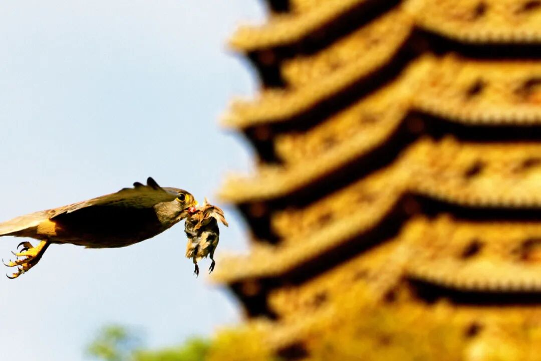 红隼是城市中最常见的猛禽之一,它们通常选择在高大的建筑上筑巢,在街道和绿地中寻找食物。画面中的背景是北京大学著名的博雅塔。王放 / 摄