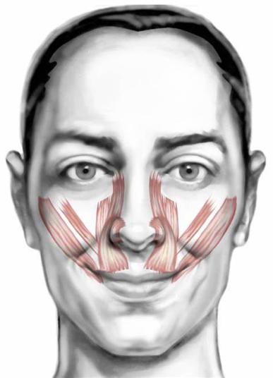 笑容一般都会牵涉两块肌肉的运动,一块是向上牵引嘴角的颧骨肌,由面部后侧斜向前面;另一块是笑肌,将下嘴唇向两侧牵拉,一些服务行业工作人员如空姐多通过锻炼这两块肌肉来展现笑容。