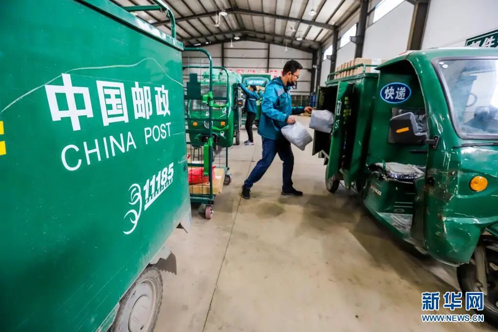 中国邮政集团河北省遵化市分公司的工作人员将快递包裹装车准备派件。新华社发(刘满仓 摄)
