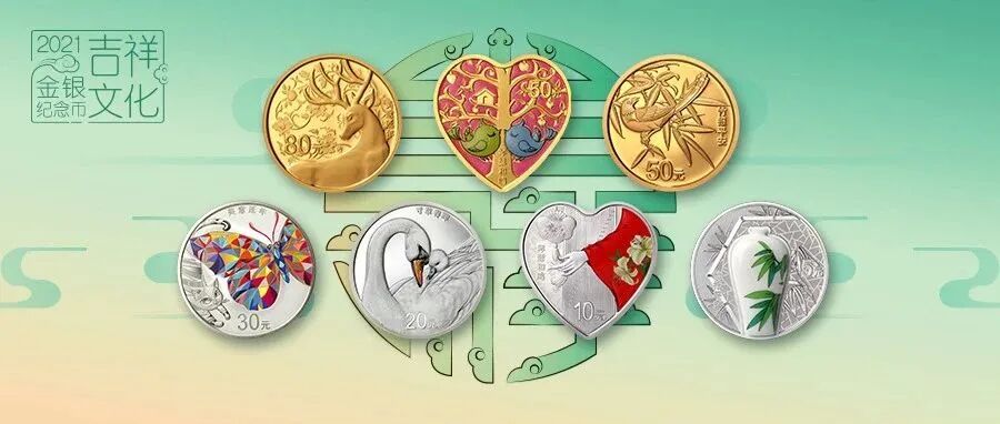 ●据中国人民银行微信公众号消息,中国人民银行自2021年5月9日起发行2021吉祥文化金银纪念币一套。该套金银纪念币共7枚,其中金质纪念币3枚,银质纪念币4枚,均为中华人民共和国法定货币。其中,3克心形金质“琴瑟和鸣”纪念币和30克心形银质“琴瑟和鸣”纪念币5月20日发行。(来源:中国人民银行微信公众号)