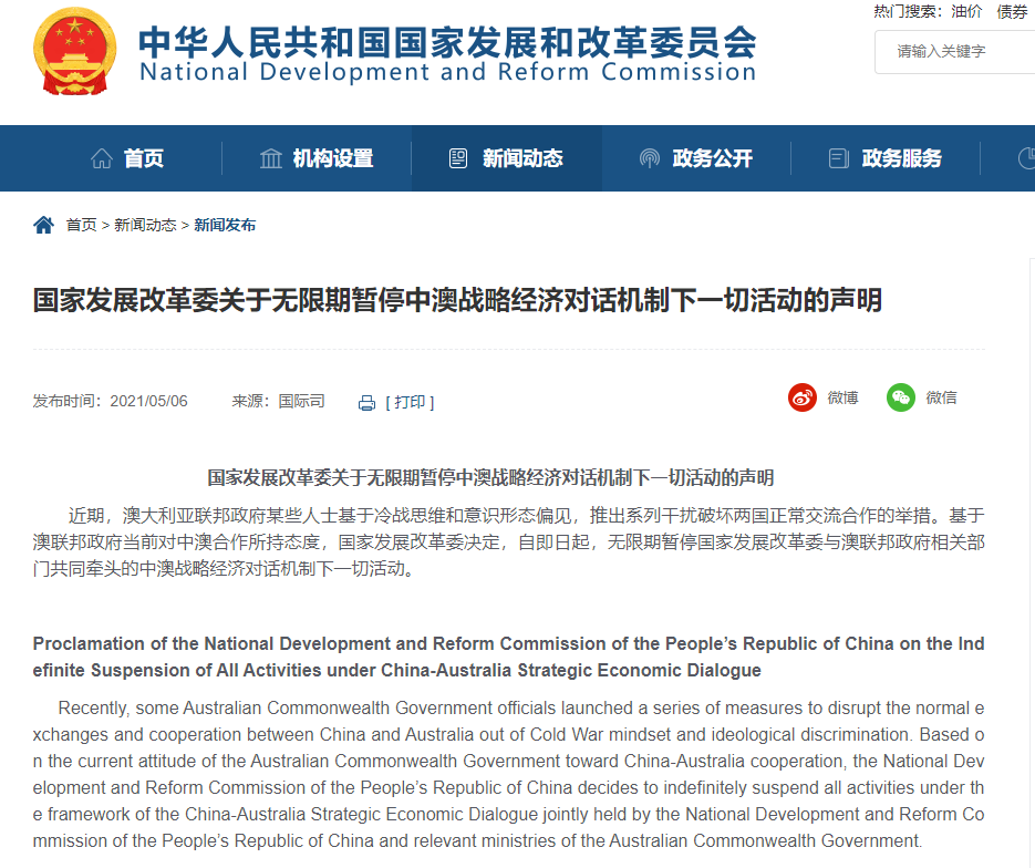 ●国家发展改革委网站5月6日消息,近期,澳大利亚联邦政府某些人士基于冷战思维和意识形态偏见,推出系列干扰破坏两国正常交流合作的举措。基于澳联邦政府当前对中澳合作所持态度,国家发展改革委决定,自即日起,无限期暂停国家发展改革委与澳联邦政府相关部门共同牵头的中澳战略经济对话机制下一切活动。(来源:国家发展改革委网站)