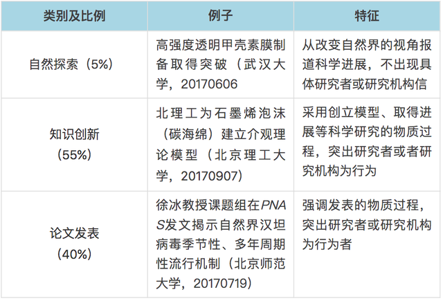 这三个维度在每一篇科学新闻中都有所体现,同时实现科学传播和宣传推广的目的。但它们的侧重点不同,可将它们放在这两个目的之间的一个连续的轴上。自然探索主要突出科学传播的目的,论文发表主要实现宣传推广研究者和研究机构,而知识创新则介于两者之间,既传播科学也宣传推广。