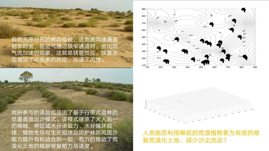 如果在同等的植被盖度下,把这种杂乱无序的,零散分布的植物,摆成行带式分布,就像图上的左下角的位置,使行带式与区域的主风向垂直,这个时候就能很有效地抑制了狭管效应的发生。我们课题组提出了,基于行带式低覆盖度造林模式,该模式继承了天人合一的精髓思想,将区域的水分承载力,水分循环运动过程,植物生长与水分利用生长规律,以及防护林防沙治沙能力的提升,有机地结合在一起,有力地推动了荒漠化治理的速度和能力,目前该模式已在我们内蒙、宁夏、甘肃得了广泛的应用。