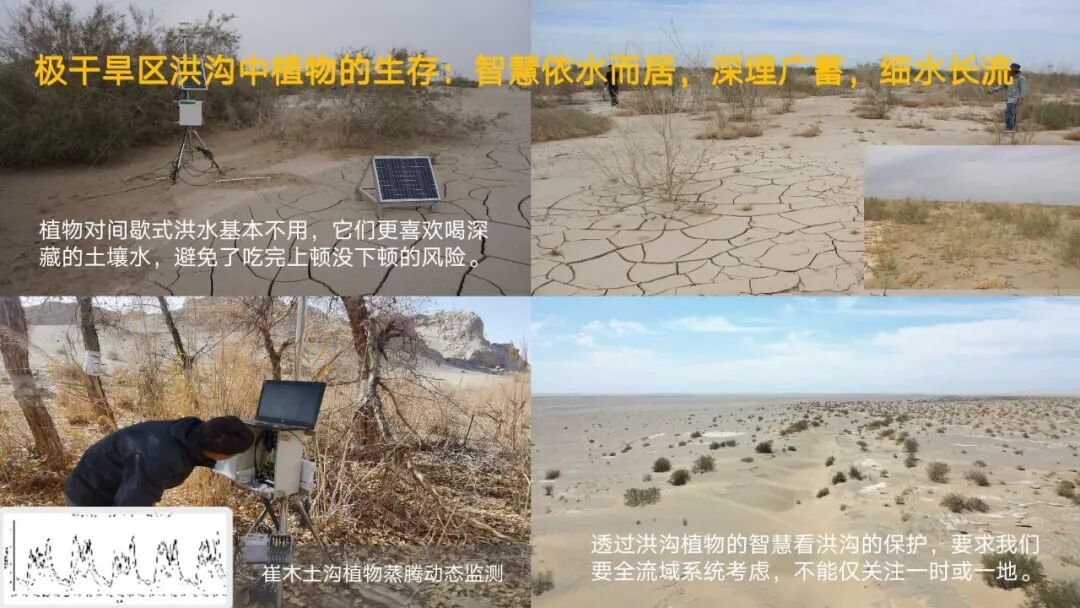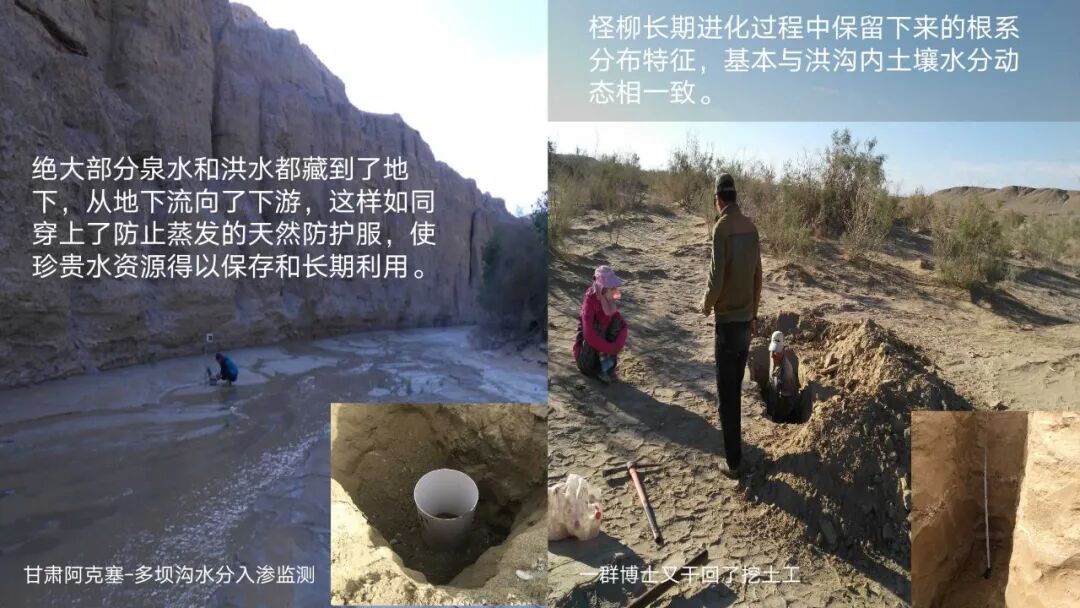 经过几年的观测,我们终于粗略地估算出,多坝沟、崔木土沟每年的洪水流量,大概在800~1000万立方米,1000万立方米是个什么概念?基本上相当于北京一天的用水量,但是对于崔木土沟而言,这点水每年却养活了30多平方公里的植被。就这点儿水,如何来养活了这大面积的干旱性植物?我们在泉水消失,洪水基本上每年都能达到的位置,挖出几个深坑,埋进去了土壤水分监测设备,我们观察发现,洪沟里边土壤基本上是以砾石和粗砂为主,当有地表水流过的时候,24小时内地表水渗入到地下的水量,接近了500毫米,其最大入渗的峰值超过1000毫米/天。也就是说绝大部分的泉水和洪水都藏到了地下,从地下流向下游,这就如同我们穿上了一层天然的防护服,使得珍贵的水资源,能在这里得以保存和长期的利用。