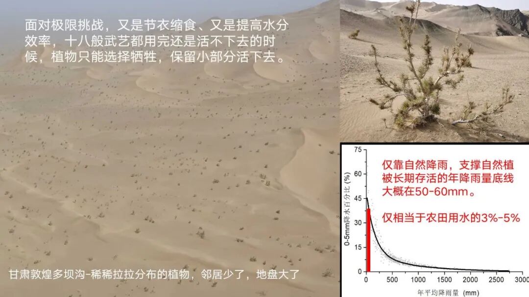 我们基本上走遍了中国的荒漠区,我们发现仅依靠自然降水,植物能够存活下来的年降雨量下限,大概是在50~60毫米。但是有很多降水都是根本湿不了地皮的毛毛雨,有可能利用的降水会不到40毫米,仅是农田用水的3%~5%,面对如此极端的恶劣环境,只能做出牺牲,牺牲大部分,让小部分植物活下去。