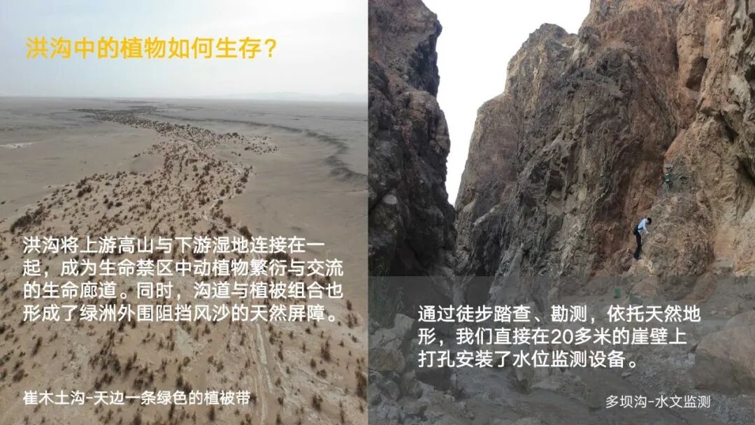 利用植物在洪沟中的生存智慧,看洪沟的保护,必须要全流域系统考虑,不能仅关注于洪沟一时一地的得失。我们通过长期的样地观察,在洪沟中游拦洪蓄水,虽然能够增加种子的萌发,以及幼苗的生长,但是这个位置洪水有时候几年才来一次,那么两三年后没有洪水灌溉,这个区域萌发的幼苗就会出现大片大片的死亡;在洪沟的上游去拦洪蓄水,你能看到的是水坝周边生命盎然,但是你没有看到的是洪水再也不能流向下游,那么下游的土壤水分得不到有效的补给,没有了水几年后你再去看洪沟,基本上沙子就把洪沟填平了,这样它周边的植被也会出现大面积死亡。