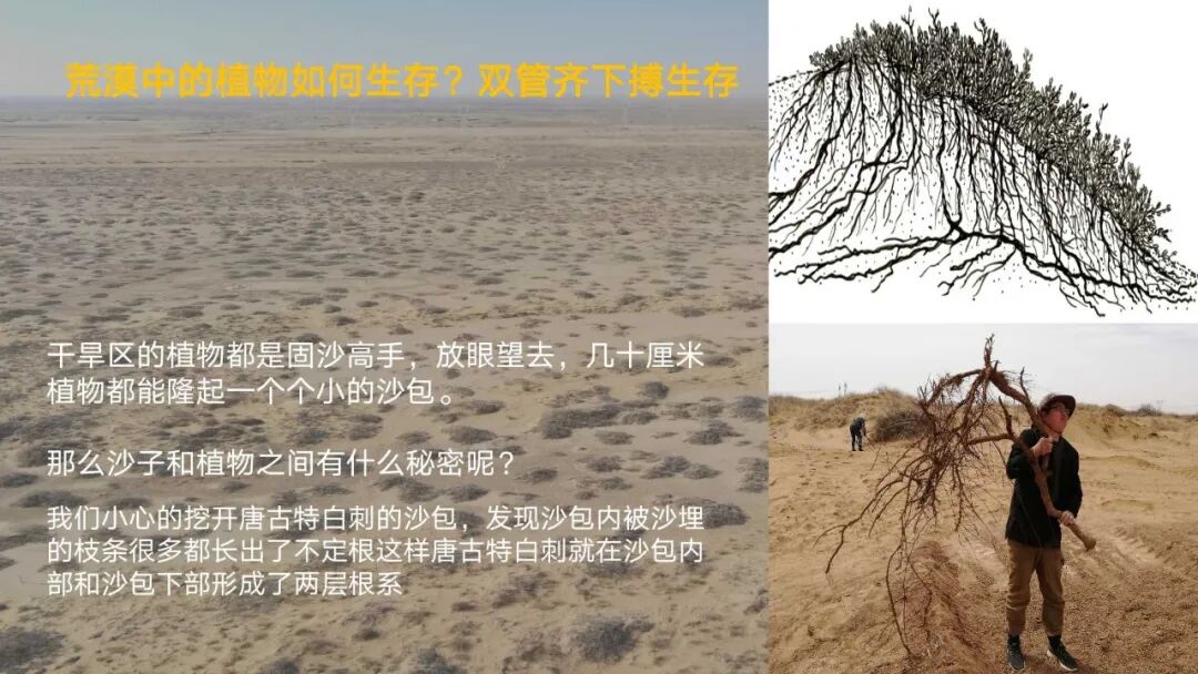 植物能在这个地方固沙和生长,是有一个很密切的合作共赢的关系。事实上我们看到是在包括热带雨林地区,温带地区,植物之间的更多是竞争,而在荒漠地区你会看到,这种竞争对立,逐渐会走向和谐的共生。举一个很典型的例子,假如这个地方是平板,那么种子过去了很难留下;假如说有一天得到一个很大的机缘,一棵植物在这里扎下了根,会形成一个沙包,其他的植物种子就有了一个家,就能在这个沙包上驻留下来,经过沙子的掩埋,给它一个环境使它能够萌发,形成了几种植物共生的模式,这也是在极端环境,需要我们学习的一个植物智慧之一。很多时候,我们把沙包推平、种树、种地,这样就造成了更大面积、更为严重的荒漠化。