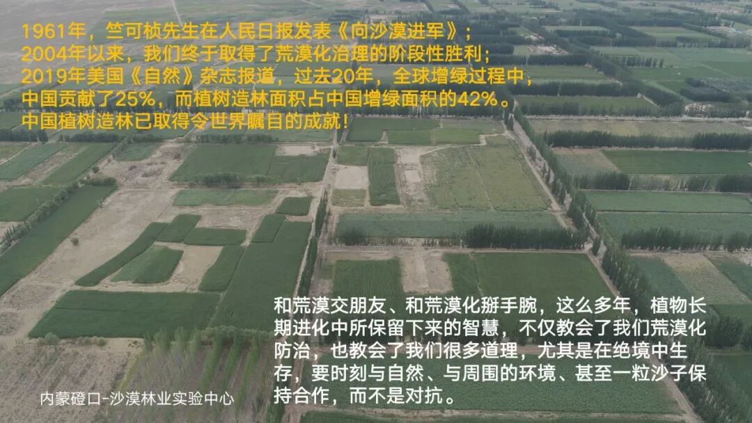 1961年竺可桢先生在《人民日报》上发表了“向沙漠进军”。2004年以来,我国终于取得了荒漠化的阶段性胜利,通过荒漠化土地与沙化土地面积监测,连续三个监测期实现了双减。2019年美国《自然》杂志报道:过去二十年全球都在增绿,我们国家贡献了25%,其中有42%来自于人工造林,取得了令全球瞩目的成就。