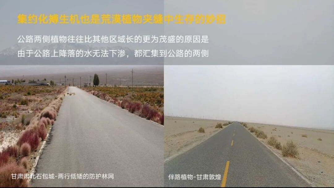 集约化搏生机,也是荒漠植物夹缝中生存的妙招。走在西北的时候,如果你留意的话,在公路上你会看到,公路两侧的植被生长比其他区域更为茂盛,经常会形成两道比较低矮的防护林网。在雨中我们看到,由于公路上的降雨无法入渗,水分都会汇集到公路的两侧,这样就补给了两侧的土壤水,从而支撑了植物的生长。
