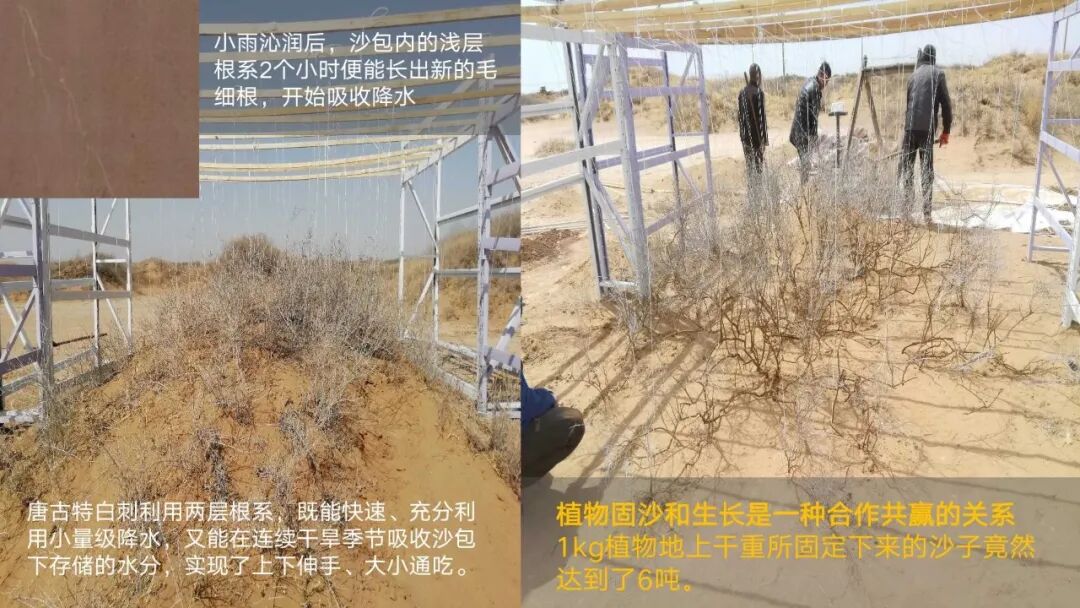 干旱区的荒漠植物都是一个个固沙高手,就是几十厘米的小植物,都能够隆起一个一个的小沙包。在内蒙古澄口,我们扒开唐古特白刺的沙包看到,沙埋的枝条中很多都长出了不定根,这样植物就在沙包的上部和沙包的下部,形成了两层的根系。当小雨沁润之后,沙包里的毛细根,两个小时就能再次长出新的毛细根,开始吸收这种小的降雨了。当大雨来临的时候,那么雨水可以透过沙包,渗入到沙包的下部,在连续的干旱季节,又能够利用深层保存的土壤水,使自己存活下去。我们一筐一筐的把沙子装起来,再一筐筐称出它的重量,竟然发现在地上的这种一公斤的植物干重,竟然能固定多少流沙呢?固定了6吨,这是之前我们自己也没有想象到的。