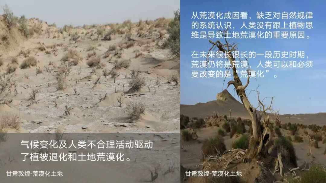 气候变化及人类不合理的活动,驱动了植被退化和土地荒漠化。从荒漠化的成因来看,人类缺乏对自然规律的系统认识,人类没有跟上植物的思维是导致荒漠化的重要原因。未来在很长很长的一段历史时期,荒漠仍将是荒漠,我们人类可以和能够改变的是荒漠化。