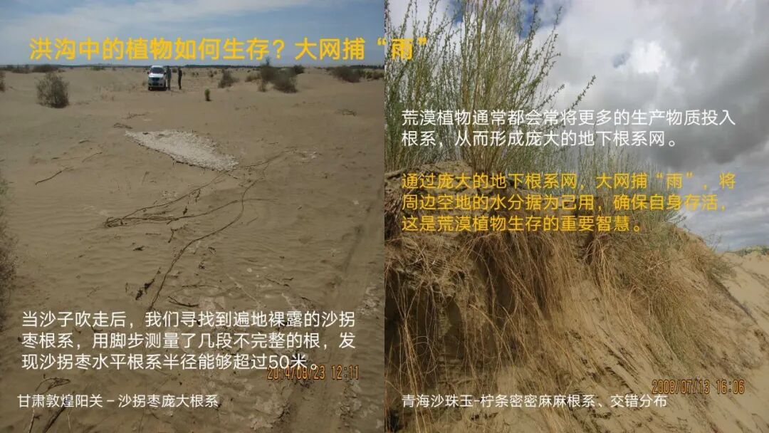 如果我们开车从北京一路向西,沿着降水减少的梯度,你会看到植物是变得越来越矮小,越来越稀疏。在敦煌的阳关,当沙子吹走后,我们寻找到这种遍地裸露的沙拐枣根系,我们用脚步测量了几段不完整的根系,发现沙拐枣的水平根,最大半径已经超过了50米。同时我们在青海的沙珠玉,看到了崩塌的沙丘下面,柠条树的根系也是密密麻麻遍地的分布。事实上干旱区的植物,都能将更多的生产物质投入到根系,从而来形成庞大的根系网,通过这个庞大的根系网大网捕“雨”,将周边空地的水分据为已用。