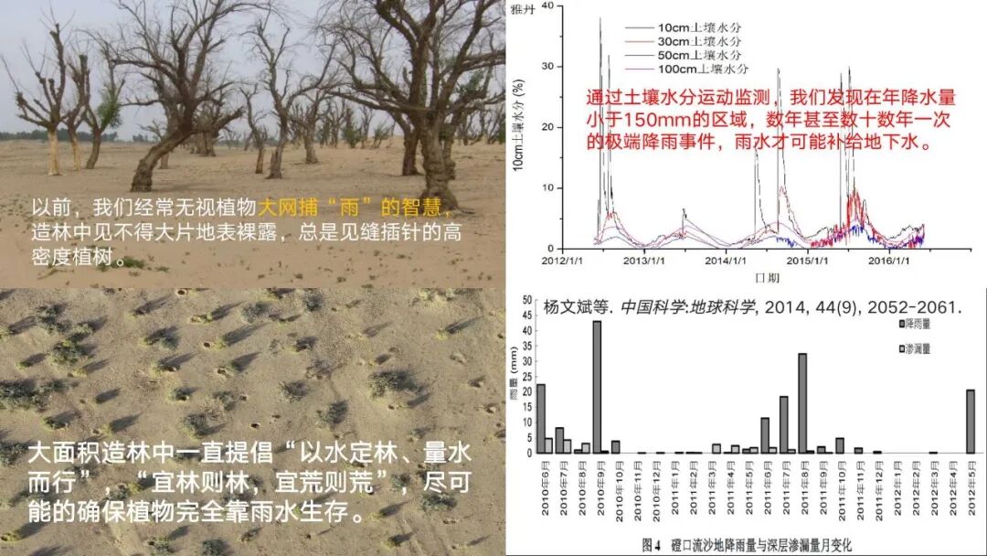 大网捕“雨”,也就成为干旱区植物生存下去的重要智慧。以前我们经常忽视,干旱区植物这种大网捕“雨”的智慧,根本看不得地表裸露,造林时总是见缝插针地高密度造林,这还不是最严重的,最严重的是在干旱区有些地方,为了增加造林的存活率,抽取地下水灌溉。通过监测我们发现,在年降雨量小于150毫米这个区域,几年甚至十几年,才有一次的极端降雨,才有可能入渗到地下,补给到地下水,盲目的抽取地下水,只能造成地下水的不断连续地下降,最后出现什么情况呢,大伙儿一起死掉。