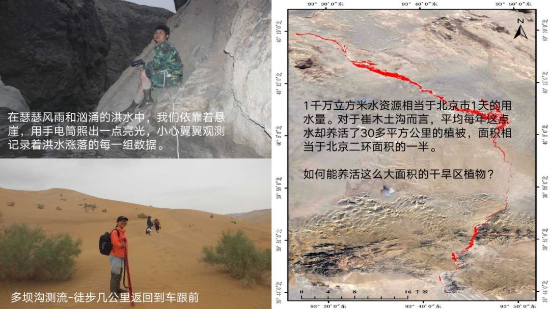 当我们跑到洪沟之后,先在崖壁上搭起了帐篷,把仪器组装起来,准备去测量洪水,绑上安全绳,上面有人拉着,底下去测定,晚上的时候还需要拿着手电筒,靠着悬崖一点一点地,小心翼翼地记下洪水涨落的每一组数据。这是我们当时测量洪水的时候,我穿着迷彩服在测定的照片。