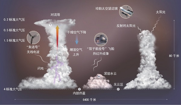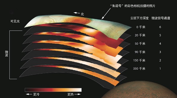 大红斑——一个巨形风暴是木星最具标志性的特征之一,1830年它首次被人类用望远镜观测到,但它迄今可能已经存在超过350年。长期的红外观测资料显示,大红斑比木星其他云层更冷,其云顶高出周围云层8千米。而关于大红斑的最基本问题之一是:它到底有多深?“朱诺号”的微波辐射仪可以窥探木星的深层,是研究大红斑的绝佳“工具”。科学家解释说,“朱诺号”发现大红斑最深处可达350千米,是地球海洋平均深度的50~100倍,底部比顶部更热。风与温度的差异有关,底部的高温可以解释大气层顶部的猛烈风暴。