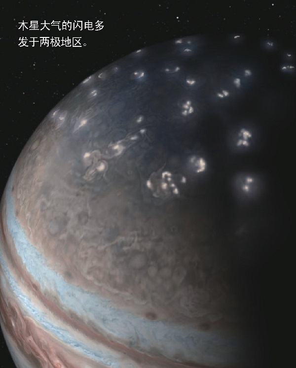 1979年,“旅行者号”探测器首次观测到木星闪电,其强度超地球闪电上万倍,但其分布与地球截然不同。地球上的闪电多发于受太阳辐射强、大气对流旺盛的热带及亚热带地区,而木星闪电则大多发于两极。根据“朱诺号”的探测数据,科学家绘制了一张木星北极区域的效果图,它显示出大规模的闪电活动。