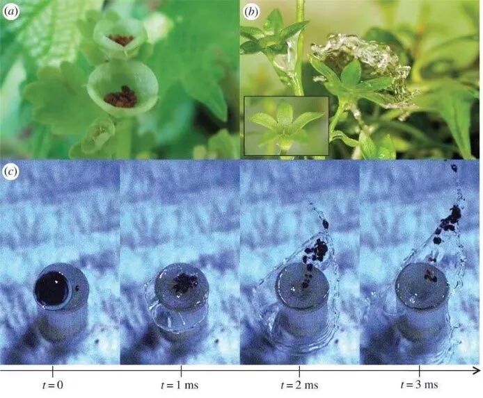 当然,小猪笼草利用雨滴的力量也不是前无古人。虽然雨滴落下时,直径只有几毫米,因空气阻力的作用,落下时的速度最终稳定下来也只有约7m/s,但对于自然界来说,它却非常重要不少生物会利用雨滴的力量来帮助自己完成孢子的散布,或者利用雨滴来溅射出自己的种子。利用雨滴的力量来发射种子的植物图源:参考文献