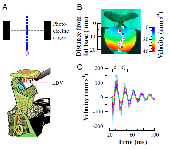 小猪笼草轻薄而又稳固的笼盖,向上微微地弯曲着,像待飞的鸟。雨滴击中笼盖顶端时,将是笼盖“起飞”的时刻。一滴雨水落下来时,打击的力量将会引起小猪笼草笼盖的强烈振动,越靠近笼盖顶端的部位振动得越厉害。小猪笼草笼盖的震动图源:参考文献