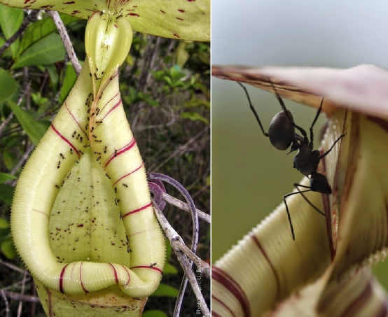 猪笼草靠捕虫笼上的蜜来吸引昆虫(多数时候是蚂蚁)来取食,它们捕虫笼的笼口一般艳丽且有蜜、还打滑,沿着笼口取食的蚂蚁一不小心就滑下去送命了。猪笼草鲜艳的笼口,让蚂蚁从笼口的棱上滑下去图源:参考文献