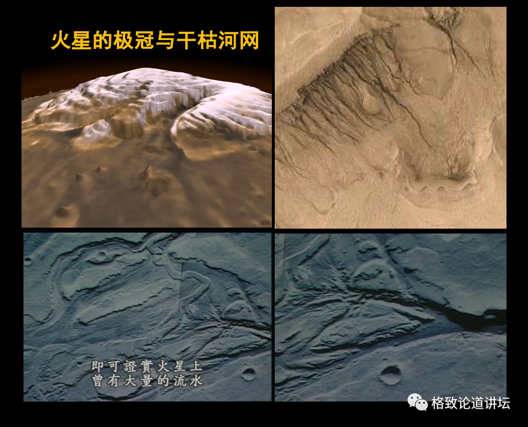 后来火星的探测拍到了很多照片。这是火星的河道,现在已经干枯了,这些河道都可以看出支流和主流。