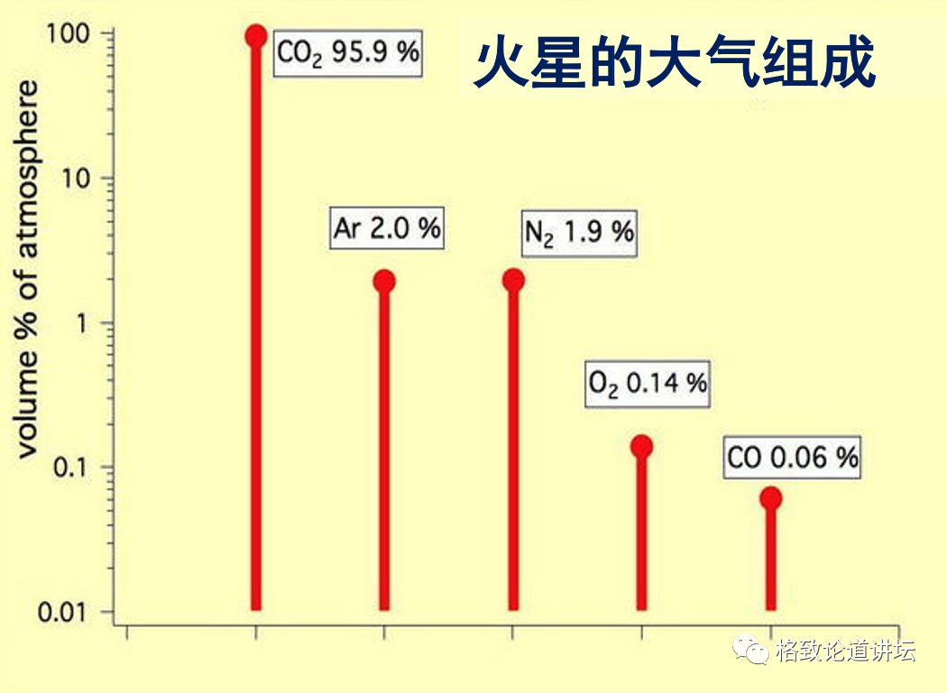 后来又有一个新发现,发现火星的大气是以二氧化碳为主的,95%是二氧化碳,之后发现也有少量的氧气,少量的水蒸气,此后还发现火星的大气里有甲烷气体。