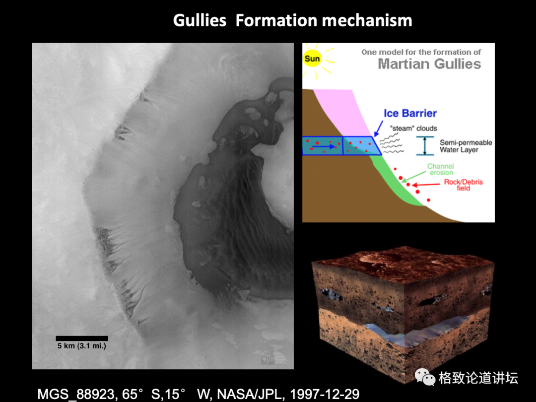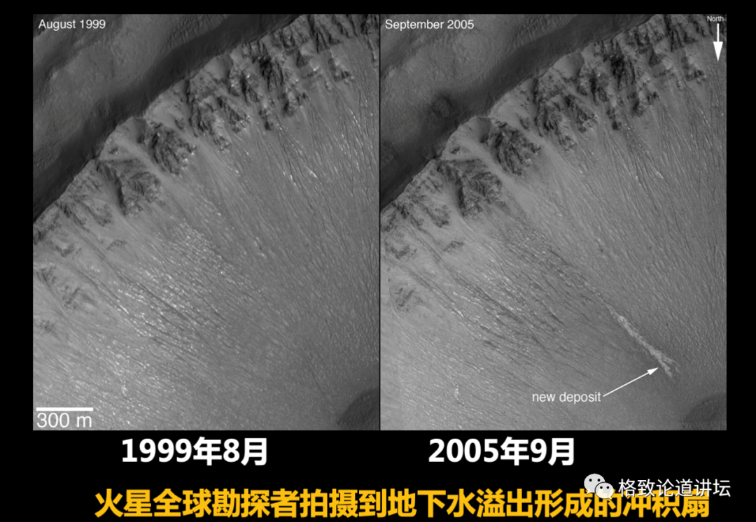 我们也积累了火星很多年的照片。这是同一个地方,先拍的那张很清楚,是一个陡坡,第二张照片里面显示出这陡坡突然塌方了,紧接着里面涌出水来,证明火星的水是在地下。