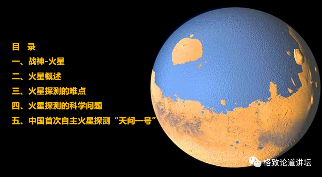 今天我跟大家分享的题目是《天问一号,中国首次自主火星探测》,分享的内容包含下面五个方面,也要向大家介绍一下我国发射的火星探测器。