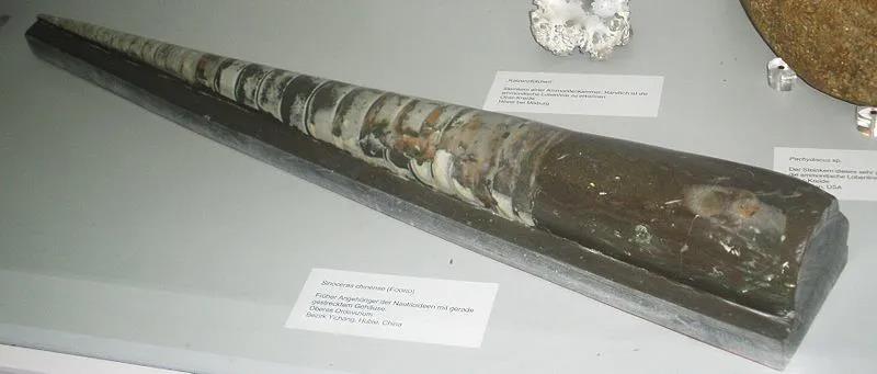 今天的主角是南京古生物博物馆馆藏的一块化石,这件化石呈细长的圆锥体,中间有好多小格格,看上去像一个宝塔,又像一根切开的竹笋。它是一块出土于湖北省,年代为奥陶世的角石化石。