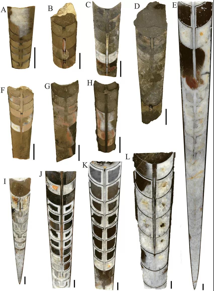 一根石头里的“笋” 一般来说,远古生物的遗骸称为化石,而古代人使用的器物称为文物,这两者通常是分开的,不过有这么一件既是文物又是化石的藏品。这是一块十分奇妙的化石,奇妙的地方是,在化石的侧面刻着北宋诗人黄庭坚写的诗:“南崖新妇石,霹雳压笋出,勺水润其根,成竹知何日。” 其实很早以前,我国的相关著作中就有关于化石的记载,而在唐宋尤为盛行,而黄庭坚在得到这块化石后也是十分喜爱,还为它题诗。对于古代文人,这块化石不过是一件供其玩赏的“奇石”,自然也就没有注意到其科研价值,但是就化石本身的价值而言,这块化石可以说是我国发现最早的一块化石标本,今天是世界博物馆日,它也是中国最古老的一件古生物收藏品。根据题诗推测,它可能是在北宋神宗元丰三年加工而成,即公元1080年,距今已有900多年的历史。 中华震旦角石 | Ghedoghedo / Wikimedia Commons 而尤为珍贵的是,当时的工匠将这块化石表面打磨得极其光滑,能够清晰看出化石的内部构造的同时,在纵横两个方面磨出切面,让化石富有立体感,而且纵切面正好磨到关键的体管部位,与现代化石切片的标准几乎完全符合。 这件化石因其形似竹笋,被称为“石笋”,但它并不是植物,而是真正的动物,名叫中华震旦角石(Sinoceras chinense)。 沧海桑田变幻的诺言 可能有朋友会问了,这角石是个什么石?角石其实是远古海洋头足动物的外壳化石,在“石笋”的根部,也就是最后一节气室中,居住着角石的软体部分,但由于软体易腐烂很难形成化石,我们只能根据它现生的亲戚鹦鹉螺推测,它有一对大眼睛,还有一堆触手。 角石的复原图 | Nobu Tamura / Wikipedia 而之后的气室全部是中空的,由一个小管相连,可以向其中注水调节身体的比重,从而实现上浮或下沉。中华震旦角石的头部有喷水管,通过这个喷水管喷水,通过水的反作用力向后游动,这是头足类动物一种特有的运动方式。 角石外壳里的腔室和中间的管道 | Xiang Fang et al. / Alcheringa An Australasian Journal of Palaeontology (2017) 中华震旦角石的化石在湖北、安徽等奥陶纪地层大量出土,足以说明其在当时数量十分庞大。而且最近我们看到,贵州省龙洞堡机场的公共厕所成了“网红”,因为它的墙砖上遍布角石的化石。我第一次去贵州时,发现酒店大堂地板的大理石、街心公园的地砖等都有不少的角石化石,当时我甚至想把地砖抠下来带回家,后来才知道这些化石数量巨大,没有太多科研价值才会如此“暴殄天物”。 湖北三游洞景区的角石化石 | 图虫创意 为什么在湖北、安徽、贵州这样的内陆会有如此多的海洋生物化石呢?原来在4亿多年前这里是一片温和而极为富饶的浅海,海洋中到处游弋着形形色色的角石,海底则爬行着各种三叶虫,后来随着数亿年的地质变化,海底逐渐隆起,才演变为今天的样貌。 其实古人也认识到了海洋生物的化石,有时会出现在陆地上。颜真卿在《麻姑仙坛记》中曾有记叙:“东北有石崇观,高石中犹有螺蚌殻,或以为桑田所变”;而沈括的《梦溪笔谈》中亦有:“……山崖之间往往衔螺蚌殻及石子如扁卵者 , 横亘石壁如带。此乃昔之海滨。今东距海已近千里,所谓大陆者,皆浊泥所湮耳。”这都是古人对地质变化的朴素理解。 带壳的触手怪 中华震旦角石的亲戚是鹦鹉螺,那它们的祖先又是什么样的呢?目前认为在寒武纪晚期,有一种名为短棒角石(Plectronoceras)的生物,被认为是最早的头足类动物(也有认为研究者认为Nectocaris pteryx是头足类软体动物的祖先类型,这里取短棒角石的说法)。随着时光流逝,自然选择一代代地塑造着它们的形态,它们的贝壳逐渐拉长,可以利用贝壳中空的部分注水或抽空,调节沉浮,身体也变得越来越复杂,体型越来越大。 短棒角石的复原图 | Apokryltaros / Wikimedia Commons 直到奥陶纪晚期,出现了有史以来最大的无脊椎动物:房角石属Cameroceras。这些头足类动物拥有巨大无比的锥形外壳,宛如旧日支配者一般,统治着那个时代的海洋(普遍认为房角石是巨大的掠食动物,但有一种观点认为,房角石可能只是温和的滤食者)。 日历娘の小知识 根据近期的分类学变动,那些最大型的角石化石,原先属于房角石,现在被重新归为内角石属Endoceras,最大的完整内角石长达5.7米。有人推测角石的外壳长度能达到9米,但不太准确。 内角石的外壳化石 | Cameroceras / Wikimedia Commons 随后角石中的一支,还将自己的外壳“卷起来”,演化成鹦鹉螺,以及更为进步的菊石。还有一部分角石用软体部分将外壳包起来,防止其损坏,慢慢地它们的贝壳越来越小,游泳速度也越来越快,最终演化为蛸类(乌贼、枪乌贼和章鱼)。 虽然角石、菊石等动物已经在海洋中消失,但它们的头足类后辈依然在大海中畅游,也许它们正在等待时机重现“旧日支配者”往日的荣光。