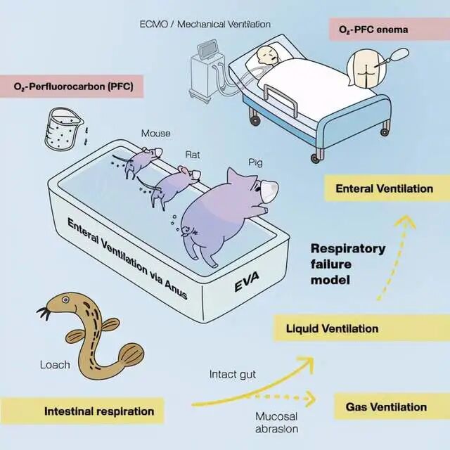 这意味着什么呢?哺乳动物,包括人类这样的大型哺乳动物,也可以像泥鳅、海参等动物一样,通过肛门来进行呼吸,缓解呼吸衰竭的症状。在动物中的试验也发现,这种直肠给氧的呼吸方式并没有产生明显的副作用。