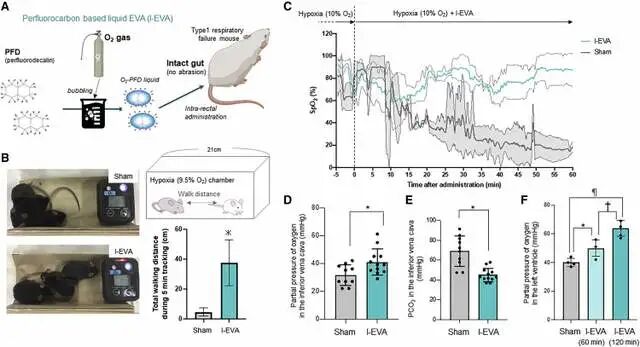 然而肠道通气系统需要打磨肠壁,刮去肠粘膜,这在临床上是不太可能的,研究人员因而决定将可以携带大量氧气和二氧化碳,与人体具有生物相容性和安全性的液态全氟萘烷(PFD),注入到动物的肠道中进行试验。仅仅用了1毫升,就让小鼠在10%低氧环境中轻松活过了60分钟;在大型动物猪的直肠中注入400毫升全氟萘烷后,其血氧浓度也得到了大幅改善,持续时间平均达到了18分钟。