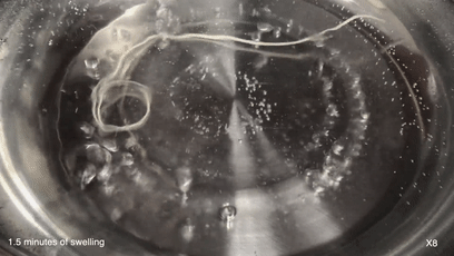 人们可以在沸水中看到一根平平无奇的普通宽面条,变成螺旋体。