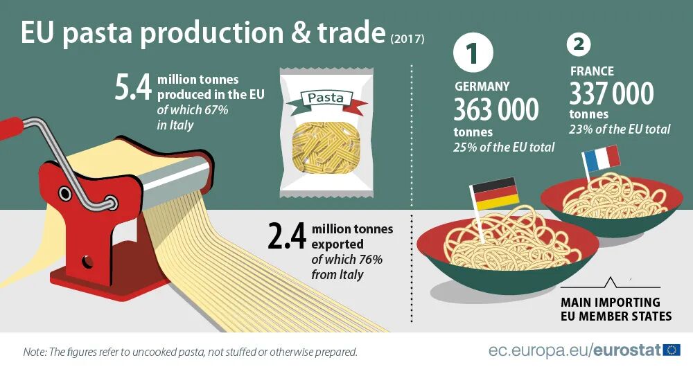 不得不说,意面市场确实是被意大利稳稳占据。根据欧盟2017年数据,意大利为全球意面贡献了一半出产。