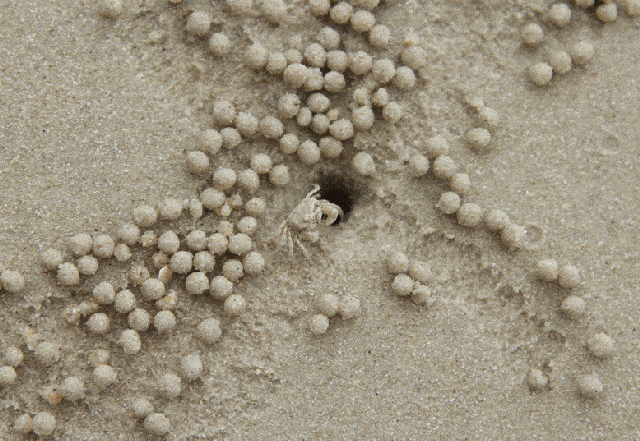 沙球开始只是一小团,后来越吹越大,直到沙球比蟹钳还大时,螃蟹一“吐”,沙球滚落脚边。为了不阻塞回洞的路,它还用步足一蹬,把沙球踹到路边。这个过程循环往复,只消三四秒钟,一粒沙球就诞生了!